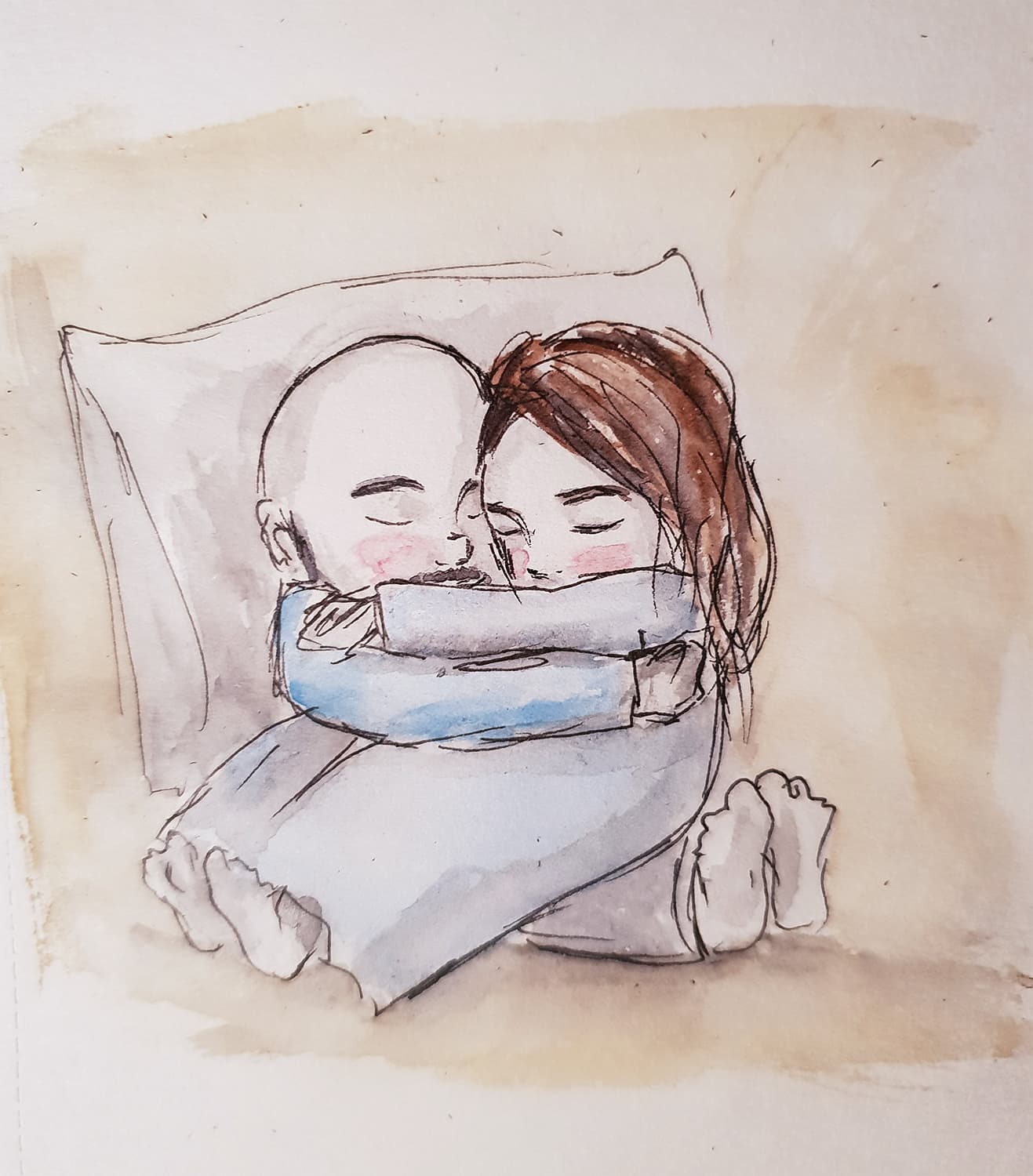 Aliya and Ante were living in different cities and countries. 🇭🇷 🇰🇿 They were meeting once every two-three months and it was tough sometimes. So one night Aliya drew us and send to Ante, saying it would be so nice just to cuddle. Ante loved it so much, she decided to draw us every day.